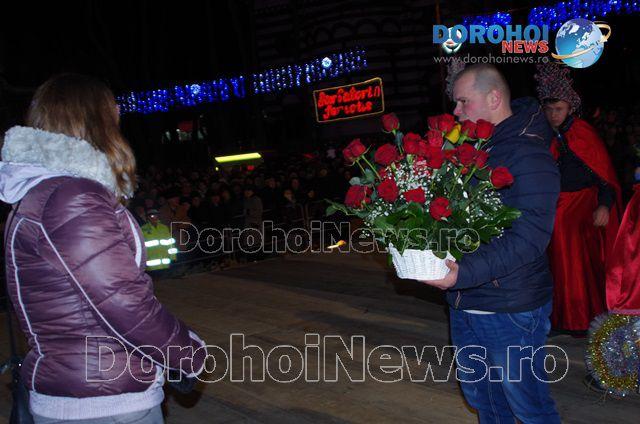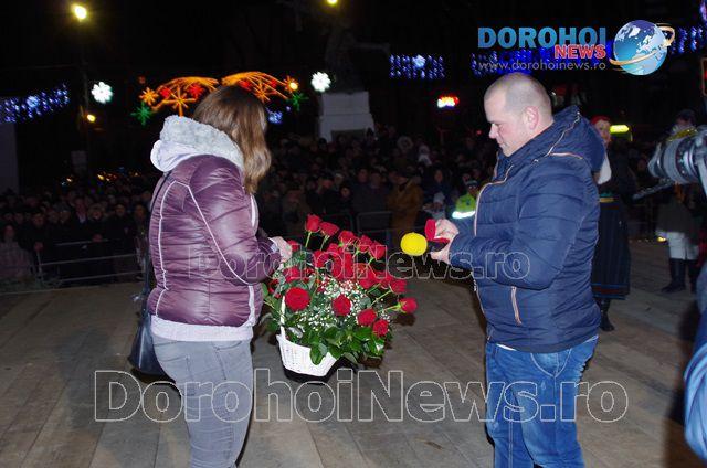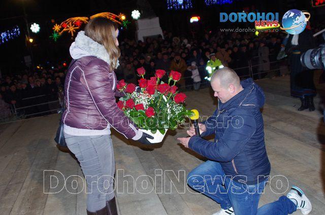 Cu emoții, un buchet imens de flori și vocea tremurândă, Derscanu Ionuț a urcat pe scenă, în fața dorohoienilor prezenți la spectacolul de datini și obiceiuri și i-a oferit inelul iubitei sale, cerând-o în căsătorie.