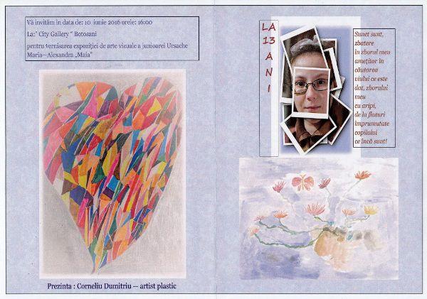 Vernisajul va avea loc la Galeria de Artă CITY GALLERY din Botoşani în ziua de vineri, 10 iunie a.c., orele 16:00 - prezintă artistul plastic Corneliu Dumitriu.