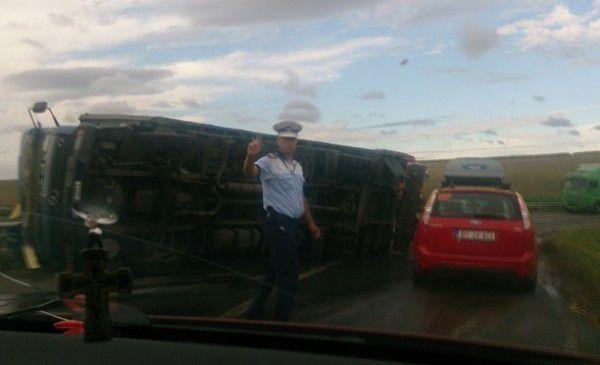 Un camion care transporta frigidere pentru un hipermarket din Botoșani s-a răsturnat, luni, în jurul orei 07.30, într-o curbă periculoasă de la limita cu județul Iași.