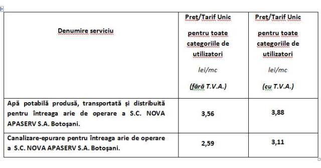 S.C. NOVA APASERV S.A. Botoşani aduce la cunoștința utilizatorilor serviciilor publice de alimentare cu apă potabilă şi de canalizare-epurare noile prețuri și tarife unice la apă și canalizare-epurare aplicate începând cu data 01 noiembrie 2016, aprobate de Autoritatea Națională de Reglementare pentru Serviciile Comunitare de Utilități Publice (ANRSC) prin Avizul nr. 421623/26.10.2016.