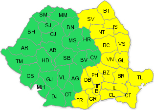 Administraţia Naţională de Meteorologie a transmis o avertizare cod galben de instabilitate atmosferică accentuată pentru zona de sud-est a ţării şi va cuprinde jumătatea estică a teritoriului. Codul galben este valabil în intervalul 19 mai, ora 10:00 - 20 mai, ora 21:00.