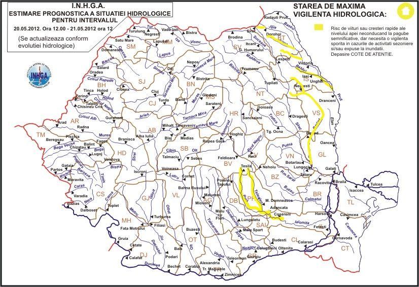 Se instituie COD GALBEN în intervalul 20.05.2012, ora 12:00 – 21.05.2012, ora 12:00, pe raurile din bazinul hidrografic: Barlad – jud. Vaslui si Galati si pe unii afluenti ai Jijiei (Buhai, Sitna, Miletin - jud. Botosani).