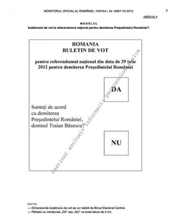Formatul buletinului de vot de la referendumului din 29 iulie 2012 pentru demiterea preşedintelui a fost aprobat printr-o hotărâre de Guvern aprobată în şedinţa de sâmbătă a Executivului.