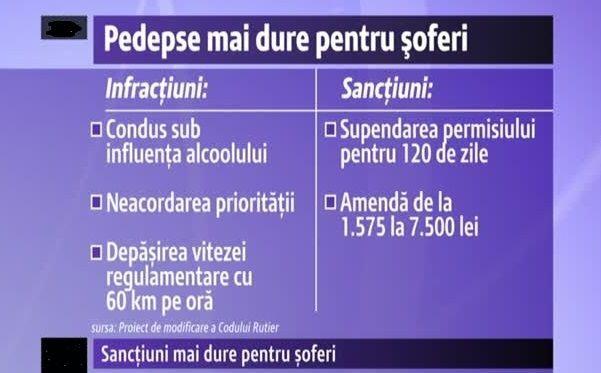 Neacordarea priorităţii pietonilor se pedepseşte în prezent cu amendă din clasa a II-a de sancţiuni, în valoare de 300 sau 375 de lei, şi cu suspendarea permisului timp de 30 de zile, iar condusul sub influenţa băuturilor alcoolice cu amendă din clasa a IV-a de sancţiuni, cuprinsă între 675 si 1.500 de lei, şi suspendarea permisului pentru 90 de zile, astfel sancţionându-se şi depăşirea limitei maxime de viteză cu peste 50 de kilometri pe oră, pragul de 60 de kilometri nefigurând în actualul Cod rutier. Sancţiunile pot fi contestate în justiţie