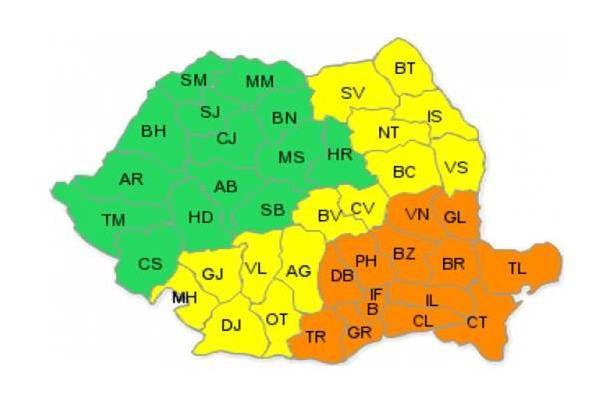 În intervalul menţionat, viscolul puternic va continua în cea mai mare parte a Munteniei şi Dobrogei, în sudul Moldovei, precum şi în zona Carpaţilor de Curbură. În aceste regiuni, dar cu precădere în judeţele Buzău, Brăila, Vrancea şi Ialomiţa, viteza vântului la rafală va depăşi temporar 70...80 km/h, zăpada va fi troienită, iar vizibilitatea se va reduce sub 50 m. În sud-estul Dobrogei, mai ales la începutul intervalului, vor mai fi ploi şi lapoviţe, moderate cantitativ şi izolat se va depune polei.