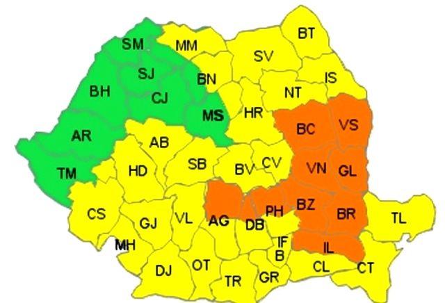 Codul portocaliu de ninsori, viscol, precipitaţii mixte şi polei este valabil în judeţele Buzău, Vrancea, Brăila, Ialomiţa, Galaţi, Vaslui, Bacău, precum şi în zona de munte a judeţelor Argeş, Dâmboviţa şi Prahova.