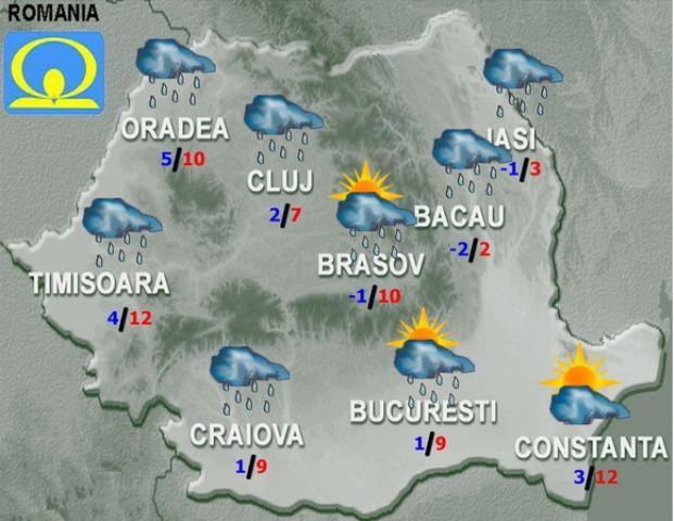 MARŢI - Vremea va continua să fie caldă pentru această dată, mai ales în vestul teritoriului şi în zona montană şi submontană. Astfel, se vor înregistra maxime termice cuprinse între 1 grad în Moldova şi 12 grade în Dealurile de Vest şi în nord-vestul Munteniei, iar temperaturile minime vor fi cuprinse între -4 şi 6 grade. Cerul va fi temporar noros şi va ploua în general slab, ziua în vestul şi sud-vestul ţării şi pe arii restrânse în rest, iar noaptea, local în nordul, centrul şi estul teritoriului şi în zona montană şi izolat în celelalte regiuni. Vor fi condiţii de polei. Precipitaţii slabe sub formă de lapoviţă şi ninsoare vor fi la munte, iar în a doua parte a intervalului, trecător şi în depresiunile Carpaţilor Orientali. Vântul va sufla slab şi moderat, cu intensificări pe crestele munţilor, în Crişana şi în Banat. Se va semnala ceaţă în zonele joase, dimineaţa cu precădere în cele estice şi sud-estice, iar noaptea mai ales în cele sudice. Sursa: ziuaveche.ro