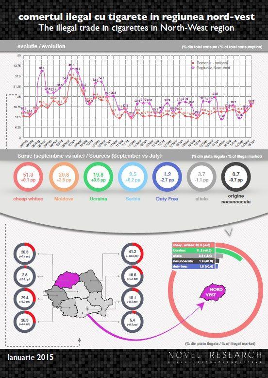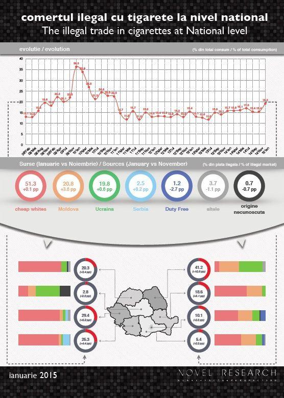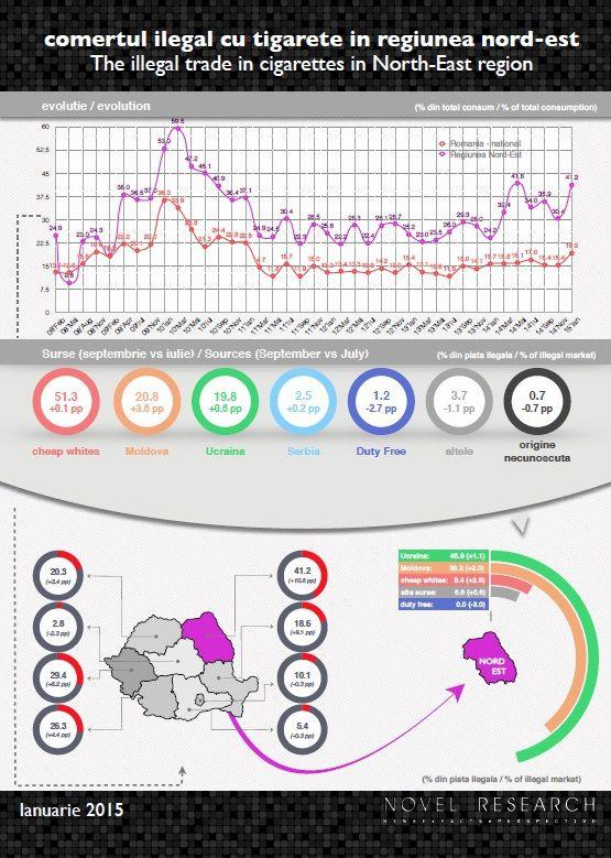 „Piața neagră a țigaretelor a crescut în ianuarie 2015 la 19,2%, față de 15,4% în noiembrie anul trecut. Cea mai mare creștere s-a înregistrat în nord-est, şi anume 10,8 p.p. De altfel, această regiune a fost, în ultimele 12 luni, cea mai vulnerabilă la expansiunea comerţului ilegal, la nivel național. În nord-vest, traficul ilegal a continuat tendinţa de creştere observată în noiembrie 2014. Este interesant de notat că, pe fondul conflictului din Ucraina, există o migrare a fluxului de ţigarete de contrabandă de la punctele de intrare în ţară aflate în regiunea nord-vest, către cele din zona de nord-est”, a declarat Marian Marcu, Directorul Companiei de Cercetare Novel Research.