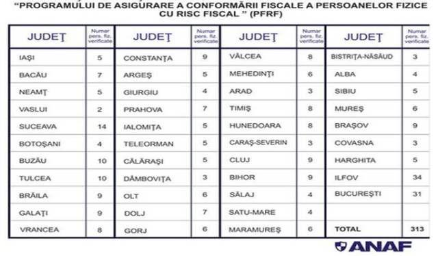 Pe locul al treilea în clasamentul pe judeţe al persoanelor verificate în cadrul „Programului de asigurare a conformării fiscale a persoanelor fizice cu risc fiscal” se află judeţul Suceava, cu 14 persoane.