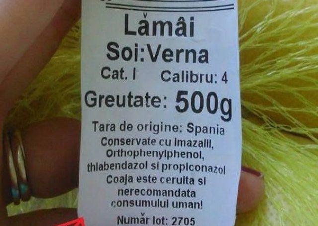 Eticheta lămâii din imaginea postată pe Radio Crazy arată o realitate cruntă şi o listă cu substanţe chimice deosebit de periculoase pentru sănătatea oamenilor.