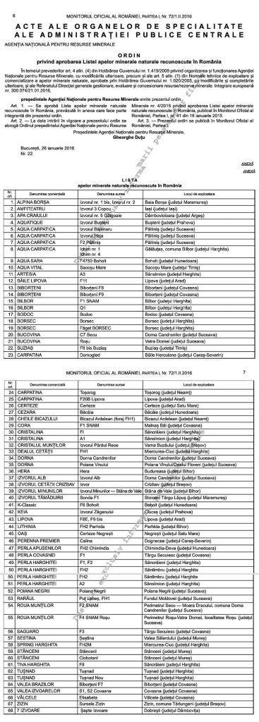 În 26 ianuarie, ANRM a aprobat noua Listă a apelor minerale naturale recunoscute în România. Potrivit documentului, publicat în 2 februarie în Monitorul Oficial, sunt recunoscute 68 de mărci de ape minerale. Lista conţine şi izvoarele de unde apa este extrasă. Alături de mărcile binecunoscute, în listă apar şi altele noi, precum cele ale unor hypermarketuri.