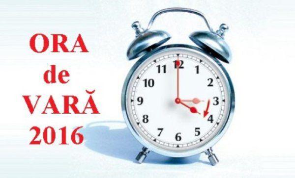 România va trece în noaptea de sâmbătă, 26 martie 2016, spre duminică, 27 martie 2016, la ora oficială de vară, ceasurile urmând să fie date înainte cu o oră, astfel că ora 03.00 va deveni ora 04.00. Trecerea la ora de vara inseamna ca vom dormi cu o ora mai putin, avand in vedere ca ceasurile vor fi date inainte.