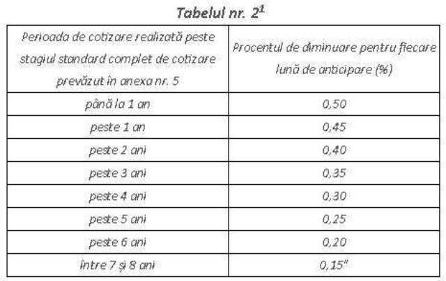 Cuantumul pensiei anticipate parţiale se stabileşte din cuantumul pensiei pentru limită de vârstă, prin diminuarea acestuia în raport cu stagiul de cotizare realizat şi cu numărul de luni cu care s-a redus vârsta standard de pensionare, conform tabelului nr. 21 anexat în foto.