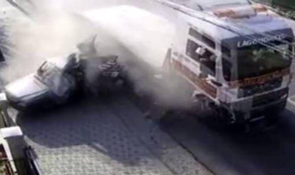 O cameră de supraveghere a surprins momentul în care un autoturism este spulberat de un TIR la Câmpulung Moldovenesc, în judeţul Suceava. Maşina este lovită şi aruncată într-o clădire.