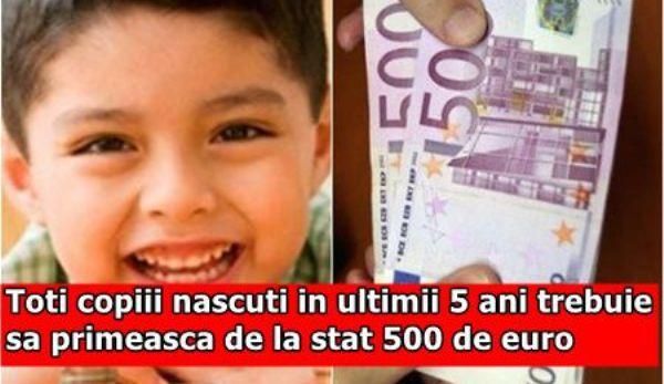Toţi copiii născuţi în ultimii 5 ani în România trebuie să primească de la stat 500 de euro, potrivit Articolului 356 din Legea nr.1/2011. Banii ar fi trebuit să fie dați începând din anul 2013, dar, din păcate autoritățile nu au aplicat legea.
