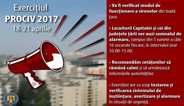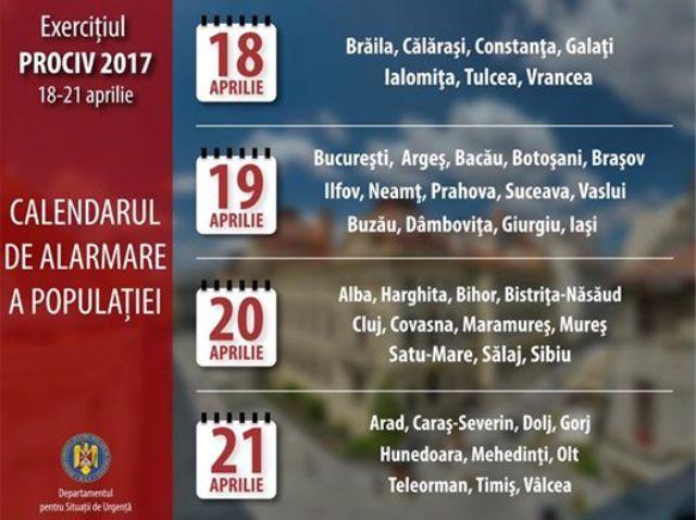 „In perioada vizata (18 - 21 aprilie, n.red.), locuitorii Capitalei si cei din judetele tarii vor auzi semnalul de alarmare, compus din 5 sunete a cate 16 secunde fiecare, in intervalul orar 10:00 – 15:00. De asemenea, in functie de caracteristicile tehnice, vor fi testate si echipamentele care permit transmiterea mesajelor de avertizare vocala catre populatie. Recomandam cetatenilor sa ramana calmi si sa urmareasca informarile inspectoratelor pentru situatii de urgenta. Mesajele tip voce vor fi particularizate cu sintagma 'EXERCITIU'", informeaza IGSU printr-un comunicat de presa.