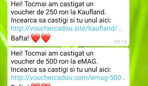 Zilele acestea circulă pe reţeaua de comunicare Whatsapp un mesaj prin care utilizatorii sunt anunţaţi că au câştigat un voucher în valoare de 250 de lei ce poate fi folosit în magazinele Kaufland. De asemenea, tot prin mesaje WhatsApp foarte mulţi oameni au fost păcăliţi cu bilete gratuite de avion sau vouchere la Emag.