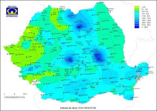 Temperaturile scad cu repeziciune pe tot parcursul țării. La primele ore ale dimineții, se înregistrau minus 13 grade la Întorsura Buzăului și minus 14 grade în Ceahlău, iar temperatura resimțită a coborât până la minus 31 de grade.