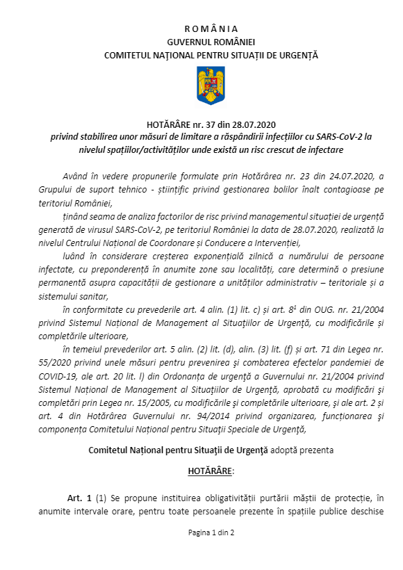 Comitetul Național pentru Situații de Urgență (CNSU) a aprobat, marți, o serie de măsuri pentru limitarea răspândirii infecțiilor cu corinavirus. Printre restricțiile care vor fi impuse la nivel local începând cu 1 august, se numără și obligativitatea purtării măștii de protecție în spațiile deschise, în anumite intervale orare, în funcție de aglomerație.