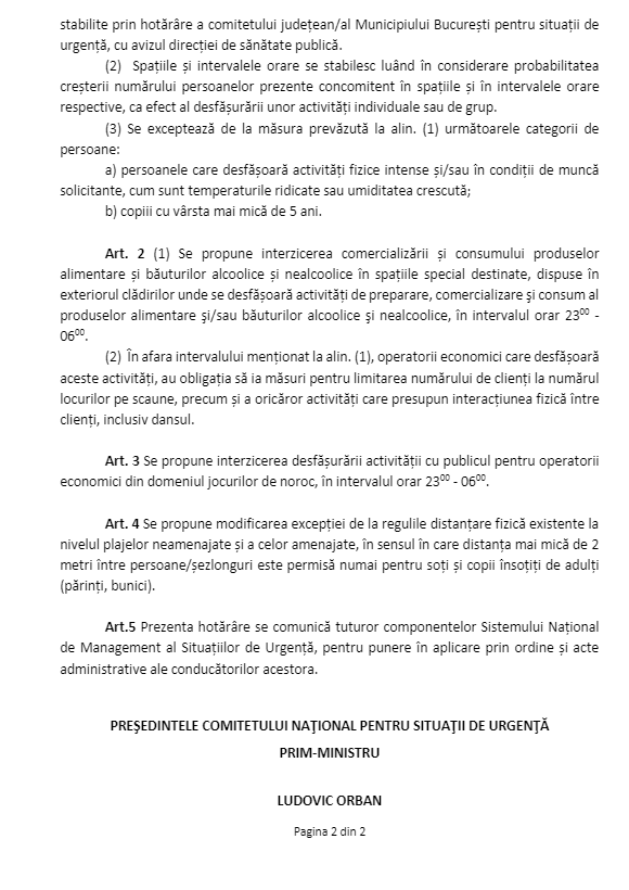 Sunt exceptate de la obligativitatea purtării măștii de protecție în spațiile deschise, persoanele care desfășoară activitate fizică intensă și copiii cu vârsta mai mică de 5 ani. Program limitat pentru terase Autoritățile au impus reguli stricte pentru terase: acestea nu vor mai putea comercializa produse alimentare și băuturi, alcoolice și nealcoolice, în intervalul 23:00 – 06:00.