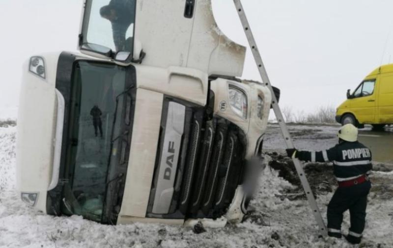 Potrivit ISU Suceava, accidentul s-a produs sâmbătă, pe Drumul European 85, în zona localității Grănicești. Tirul încărcat cu ciocolată s-a răsturnat pe șoseaua acoperită parțial cu zăpadă.