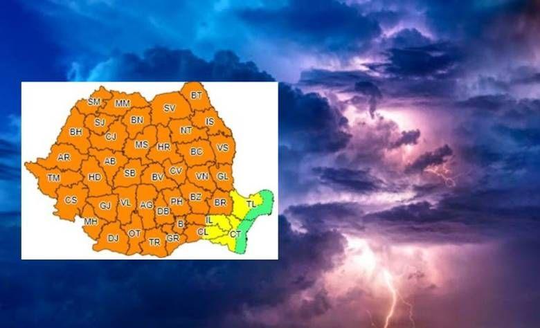 Administrația Națională de Meteorologie a emis un cod portocaliu de vijelii, descărcări electrice, averse torențiale și grindină valabil pentru cea mai mare parte a țării.