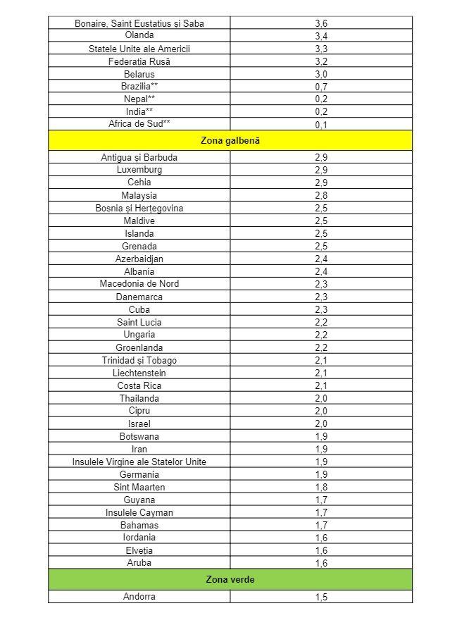 din zona verde, în urma creșterii incidenței: Cehia, Danemarca, Ungaria, Germania, Elveția, Liechtenstein, Groenlanda, Iordania si Botswana;