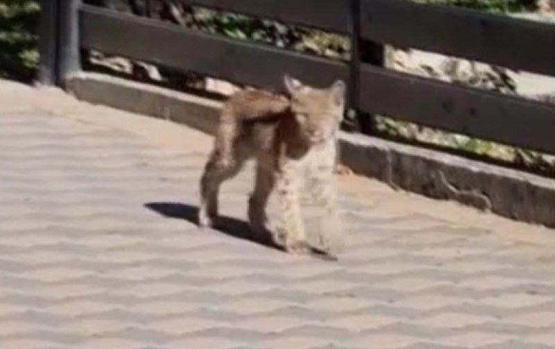 Un pui de râs carpatin a coborât din pădurea din apropierea localității Falcău până în zona locuită, fără să pară deranjat prea mult de prezența oamenilor.