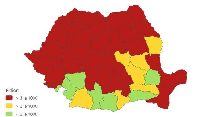 Cea mai mare incidenţă este în Cluj (13,2), judeţ urmat de Timiş (10,91), Ilfov (9,66) şi Suceava (8,46).