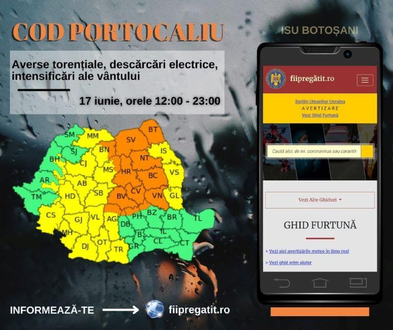 Meteorologii au actualizat prognoza pentru următoarele ore și au instituit COD PORTOCALIU de ploi abundente, însoțite de frecvente descărcări electrice, vijelii și căderi de grindină pentru ziua de sâmbătă, 17 iunie 2023, de la ora 12.00, până la ora 23.00, în județul Botoșani.