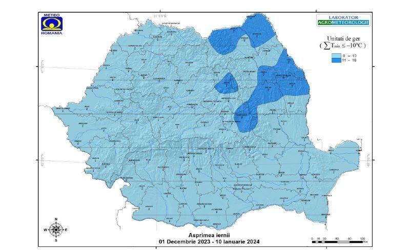 Pentru evaluarea condiţiilor de iernare ale speciilor de toamnă s-a analizat indicele termic specific perioadei 01 decembrie 2023 – 10 ianuarie 2024, respectiv cuantumul temperaturilor minime negative din aer (ΣTmin.≤-10°C/„unităţi de ger”), ce caracterizează anotimpul rece prin ASPRIMEA IERNII.