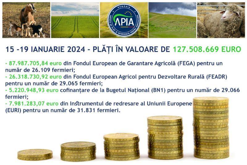 Agenția de Plăți și Intervenție pentru Agricultură (APIA) informează că, în perioada 15 – 19 ianuarie 2024, a efectuat plăți pentru anul de cerere 2023 în suma totală de 127.508.669 euro, astfel: