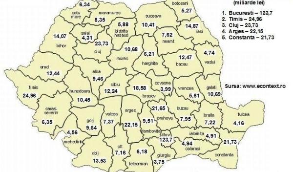 Capitala este urmata, oarecum previzibil, de Timis, Cluj, Arges, Constanta si Prahova, valoarea economica a acestor cinci judete depasind cu putin PIB-ul Bucurestiului. La polul opus, se afla Tulcea (cu o valoare a economiei estimata la 4,16 miliarde lei), Covasna (3,99 miliarde lei) si Giurgiu (3,75 miliarde lei). Ultimele doua judete sunt si singurele a caror economie ar valora sub 1 miliard de euro, la cursul actual de 4,1 lei pentru 1 euro. Cu alte cuvinte, acestea sunt orasele care produc cel mai putin, care obtin cei mai putini bani pe marfa pe care o produc.