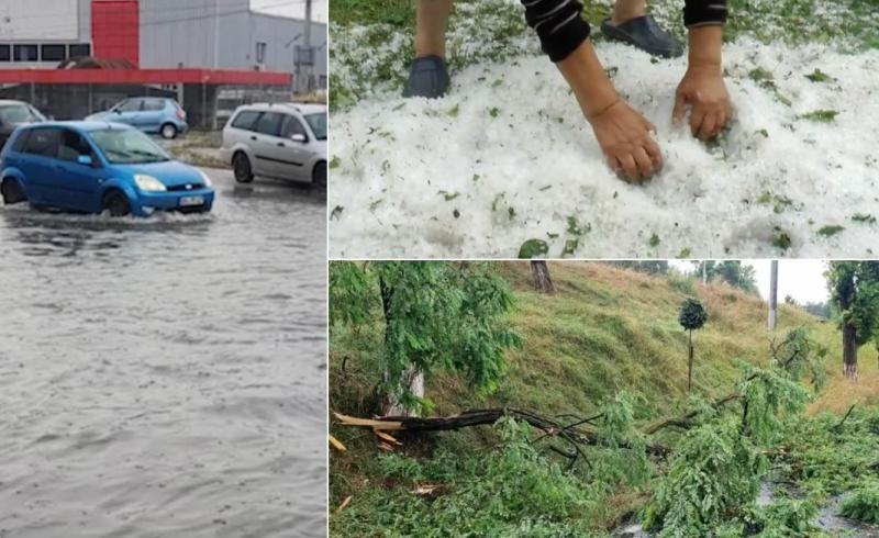 În doar 30 de minute, ploaia şi grindina uriaşă au distrus complet grădinile, iar apa a ajuns în case.
