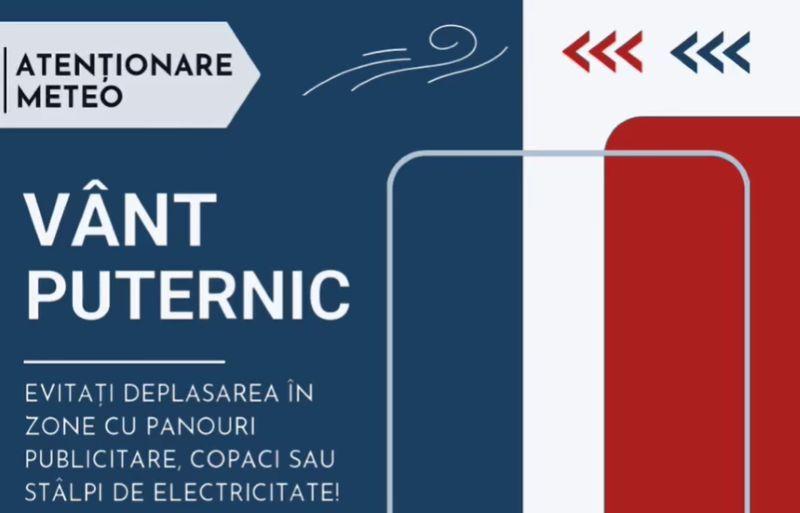Potrivit meteorologilor, vântul va prezenta intensificări cu viteze de 50 - 60 km/h.