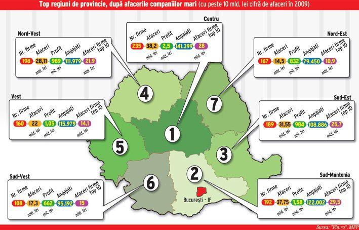 Primul loc din clasamentul „Fin.ro” este ocupat de Regiunea Centru, formata din judetele Mures, Harghita, Covasna, Brasov, Sibiu, Alba. Aici, companiile cu afaceri de peste 10 mil. lei anual din fiecare judet care compune regiunea, 235 la numar, insumeaza businessuri de 38,2 mld. lei, in conditiile in care au un numar total de 141.399 de angajati, potrivit datelor Registrului Comertului din 2009. Cu afaceri de 13,3 mld. lei, judetul Brasov ar urma sa devina „motorul” economic al acestei regiuni, urmat de Sibiu, cu 10,8 mld. lei. Astfel, in judetul Brasov cele mai puternice firme sunt Selgros Cash&Carry (3 mld. lei), Autoliv Romania (1,1 mld. lei), Schaffler Romania (996 mil. lei), dar si Europharm (647 mil. lei). In Sibiu, cele mai importante businessuri sunt ale companiilor Polisano (841 mil. lei) si Continental Automotive System (496 mil. lei). Tot in Sibiu isi au cartierul general companiile de stat Romgaz si Transgaz, cu cifre de afaceri de 3,1 mld. lei, respectiv 1,1 mld. lei. In Mures cea mai importanta companie este E.ON Gaz Romania, cu o cifra de afaceri de 2,5 mld. lei, dar si Azomures (743 mil. lei). In Alba cele mai mari companii sunt Holzindustrie Schweighofer (875 mil. lei) si Kronospan Sebes (547 mil. lei). Simbolul judetului Harghita este apa minerala Borsec, produsa de Romaqua Grup, care are o cifra de afaceri de 532 mil. lei. In privinta judetului Covasna, aici isi are cartierul general Domo Retail (726 mil. lei).