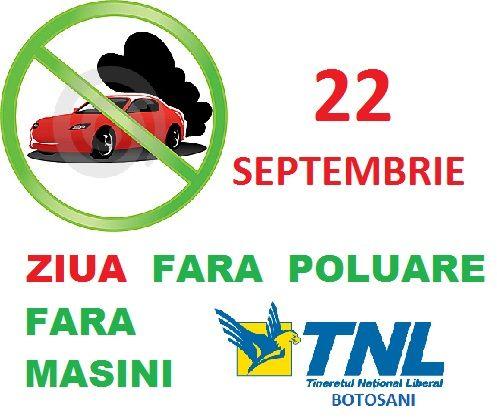 Sambata 22 septembrie de Ziua Europeana Fara Masini, la initiativa Organizatiei Municipale de Tineret a PNL Botosani, Bulevardul Mihai Eminescu va fi inchis pe sectorul de la intersectia cu Str. Marchian pana la intersectia cu Str. O.Onicescu si va deveni zona pietonala oferita botosanenilor.Tinerii liberali vor sa traga un semnal de alarma asupra poluarii si invita botosanenii la o plimbare pe jos sau cu bicicleta.