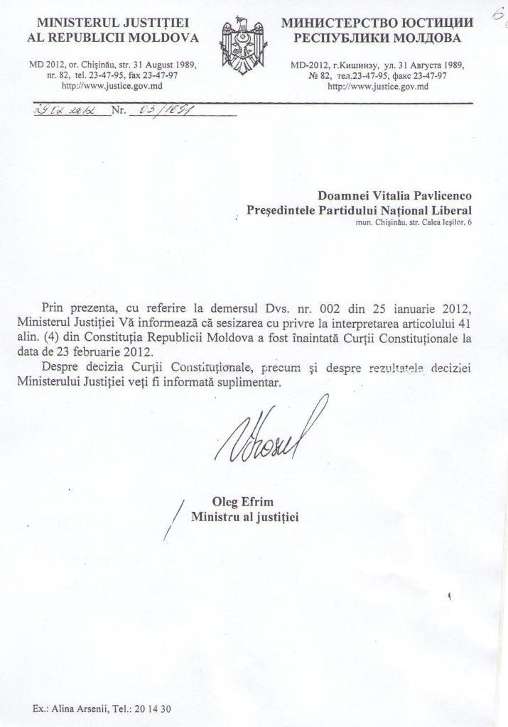Anexăm aici fragmentul statutar care a constituit motivul litigiului PNL vs Ministerul Justiţiei şi Răspunsul ministrului justiţiei din 29 februarie 2012, în care ministrul justiţiei Oleg Efrim scrie preşedintelui PNL „Despre decizia Curţii Constituţionale, precum şi despre rezultatele deciziei Ministerului Justiţiei veţi fi informată suplimentar”, ceea ce nu s-a întîmplat.