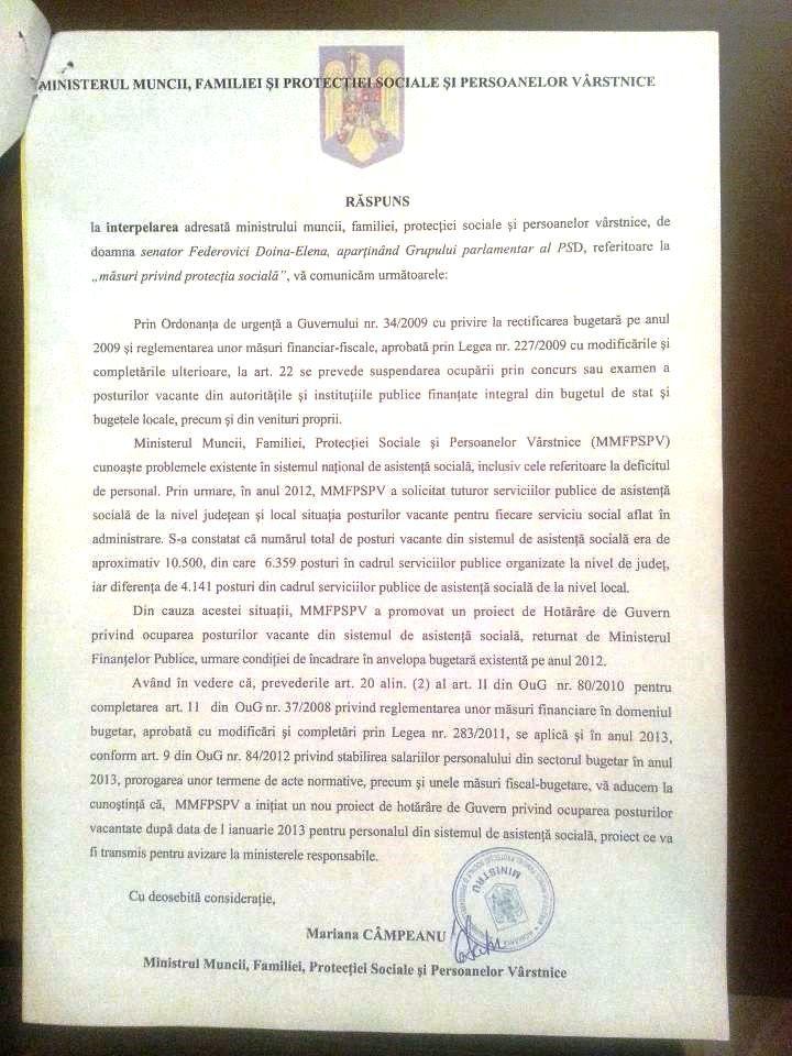 Avand in vedere interpelarea adresata de catre senatorul PSD Doina Federovici ministrului muncii, familiei, protectiei sociale si persoanelor varstnice in data de 11.02.2013 cu privire la gravele probleme cu care se confrunta unitatile de asistenta sociala de pe raza judetului Botosani, a fost primit raspunsul.