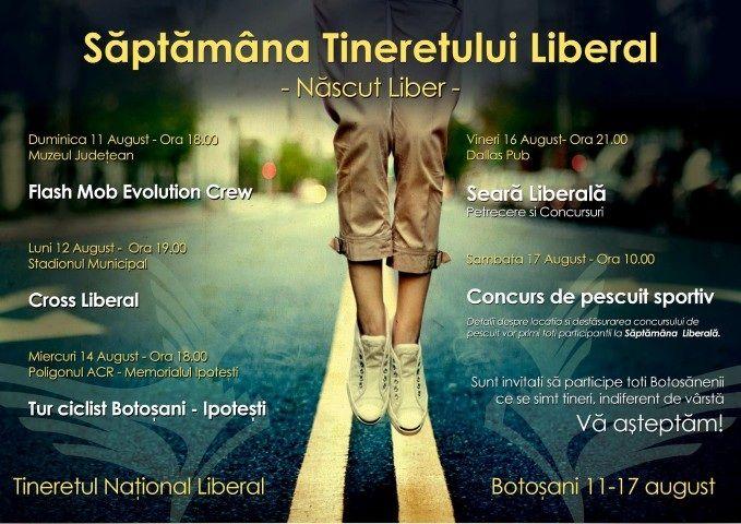 Programul acțiunilor continuă și în zilele ce urmează. Astfel, luni, 12 august, chiar de Ziua Internațională a Tineretului, TNL Botoșani organizează, începând cu orele 19.00, un cross pe Stadionul Municipal, iar pe 14 august, de la orele 18.00, va avea loc un Tur ciclist pe circuitul Poligon ACR- Memorialul Ipotești. Pe 16 august, TNL organizează, de la orele 21.00, Seara Liberală în Dallas Pub (petrecere-concurs), iar pe 17 august, începând cu orele 10.00, concurs de pescuit sportiv.