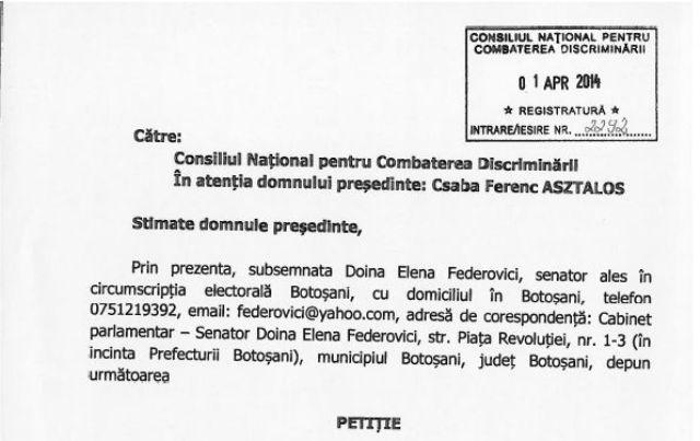Presedintele Consiliului Judetean Botosani, Florin Turcanu, a fost reclamat marti, oficial, la Consiliul National pentru Combaterea Discriminarii (CNCD), pentru discriminare si hartuire, de catre senatoarea PSD Doina Fedorovici.