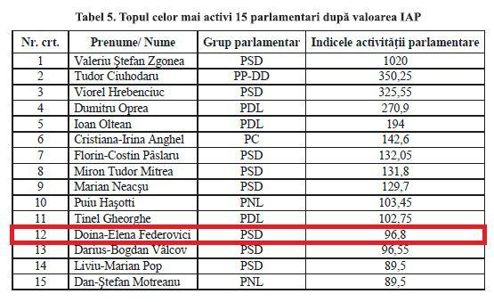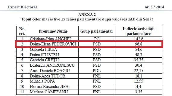 Conform unui articol publicat în revista mai sus menţionată, s-a realizat primul indice agreat al activităţii parlamentare: clasamentul grupurilor parlamentare şi al parlamentarilor. Astfel, s-a ajuns la concluzia că cele 65 de femei parlamentare sunt cu 40% mai active decât toţi cei 509 bărbaţi luaţi la un loc în Parlamentul României.