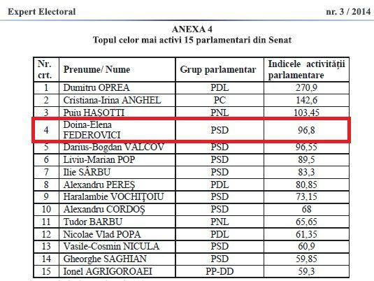 Conform publicaţiei “Expert Electoral” nr. 3 (7)/2014 al Autorităţii Electorale Permanente, senatorul Doina Elena Federovici ocupă locuri fruntaşe atât în ceea ce priveşte activitatea în Senat cât şi în ansamblul Parlamentului României, ocupând: