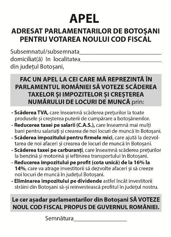 Astfel, botoșănenii le vor putea cere parlamentarilor să voteze în favoarea măsurilor din noul Cod Fiscal, care va avea ca efect scăderea prețurilor, creșterea nivelului de trai și stimularea mediului de afaceri pentru crearea de noi locuri de muncă. „Fac un apel la cei care mă reprezintă în Parlamentul României să voteze scăderea taxelor și impozitelor și creșterea numărului de locuri de muncă”, se arată în „Apelul adresat parlamentarilor de Botoșani pentru votarea noului Cod Fiscal”.