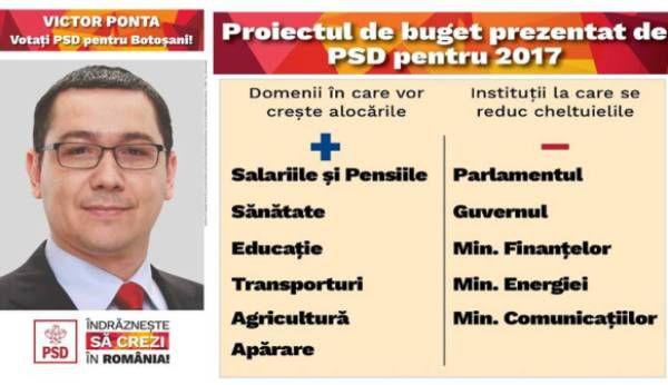 Astfel, în Bugetul pe 2017, PSD mizează pe o creștere economică de 5,5%, ceea ce va însemna o creștere a Produsului Intern Brut până la 815,2 miliarde lei. Astfel veniturile totale la buget estimate de PSD vor fi de 253,7 miliarde lei, în timp ce cheltuielile prevăzute vor fi în cuantum de 275,6 miliarde, ceea ce înseamnă că deficitul bugetar va fi de 2,7%, sub pragul de 3% care indică eficiența economică.