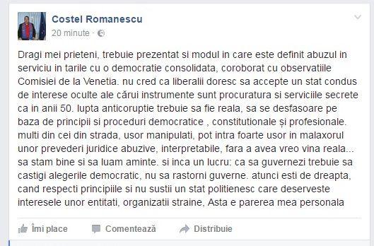 „Dragi mei prieteni, trebuie prezentat si modul in care este definit abuzul in serviciu in tarile cu o democratie consolidata, coroborat cu observatiile Comisiei de la Venetia. Nu cred ca liberalii doresc sa accepte un stat condus de interese oculte ale cărui instrumente sunt procuratura si serviciile secrete ca in anii 50. Lupta anticoruptie trebuie sa fie reala, sa se desfasoare pe baza de principii si proceduri democratice, constitutionale și profesionale. Multi din cei din strada, usor manipulati, pot intra foarte usor in malaxorul unor prevederi juridice abuzive, interpretabile, fara a avea vreo vina reala… sa stam bine si sa luam aminte. Şi inca un lucru: ca sa guvernezi trebuie sa castigi alegerile democratic, nu sa rastorni guverne. Atunci esti de dreapta, cand respecti principiile si nu sustii un stat politienesc care deserveste interesele unor entitati, organizatii straine. Asta e parerea mea personala”, este mesajul postat pe facebook de Costel Romanescu, primarul comunei Plătiniş.