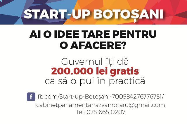 Deputatul PSD Răzvan Rotaru a anunțat astăzi că a luat decizia de a realiza o pagină de facebook „Start-up Botoșani” dedicată tinerilor care doresc să acceseze primul program guvernamental prin care primesc de la stat 200.000 de lei pentru deschiderea unei afaceri noi.