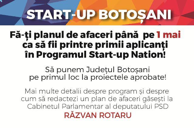 „Am deschis Start-up Botoșani, prima pagină de facebook pentru comunicarea directă cu tinerii antreprenori. Vreau să am o consultare permanentă cu botoșănenii pentru a-i informa cu privire la condițiile pe care trebuie să le îndeplinească pentru a beneficia de finanțare din partea Guvernului astfel încât să își realizeze propriul business. Fac apel la toți tinerii să intre pe https://www.facebook.com/Start-up-Botoșani-700584276776751/ și să consulte toate documentele pe care le-am încărcat pentru a începe să își pregătească dosarele de finanțare. De asemenea, îi rog să posteze întrebări sau să îmi semnaleze ce nelămuriri au cu privire la acest program”, a declarat Răzvan Rotaru.