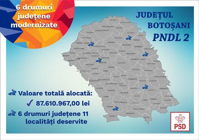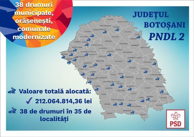 Astfel, vor fi modernizate 38 drumuri municipale, orășenești și comunale din 35 de unități administrativ teritoriale, respectiv: municipiile Botoșani si Dorohoi, Flămânzi, Bucecea, Ștefănești, Frumușica, Cristești, Coșula, Lunca, Todireni, Santa Mare, Vlădeni, Stăuceni, Blândești, Unțeni, Vârfu Câmpului, Leorda, Văculești, Brăești, Nicșeni, Dobârceni, Cândești, Mihăileni, Dersca, Lozna, Hilișeu-Horia, Vlăsinești, Ripiceni, Vorniceni, Ibănești, Cristinești, Suharău, Concești, Viișoara, Mitoc, iar 6 tronsoane de drum județean care deservesc 11 localități vor fi rebilitate.