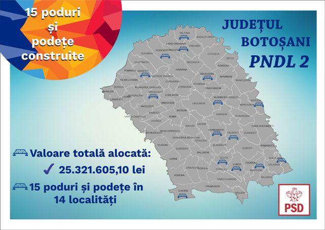 Totodată vor fi construite 15 poduri și podețe în 15 localități: Tudora, Sulița, Lunca, Hlipiceni, Santa Mare, Trușești, Gorbănești, Broscăuți (CJ), Vlăsinești, Ripiceni, Ibănești, Drăgușeni, Hudești, Darabani, Păltiniș. Este pentru prima dată când un guvern finanțează astfel de obiective pentru comunitățile locale prin programe la nivel național.